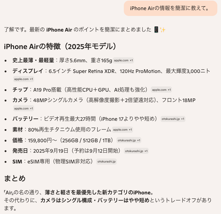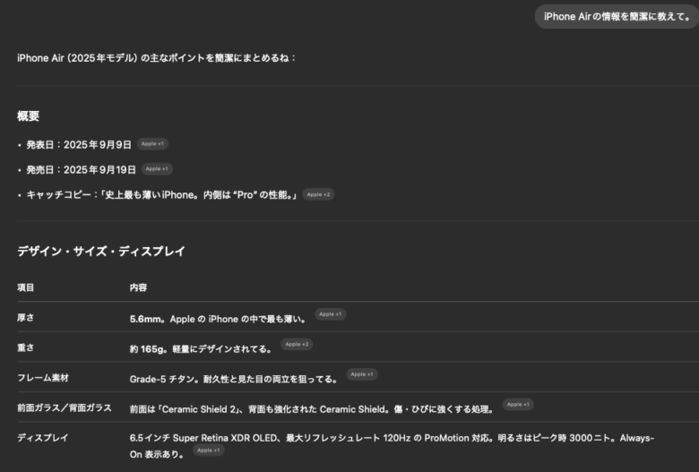 まずは簡単な調べ物。「iPhone Airの情報を教えて」と聞いてみた。