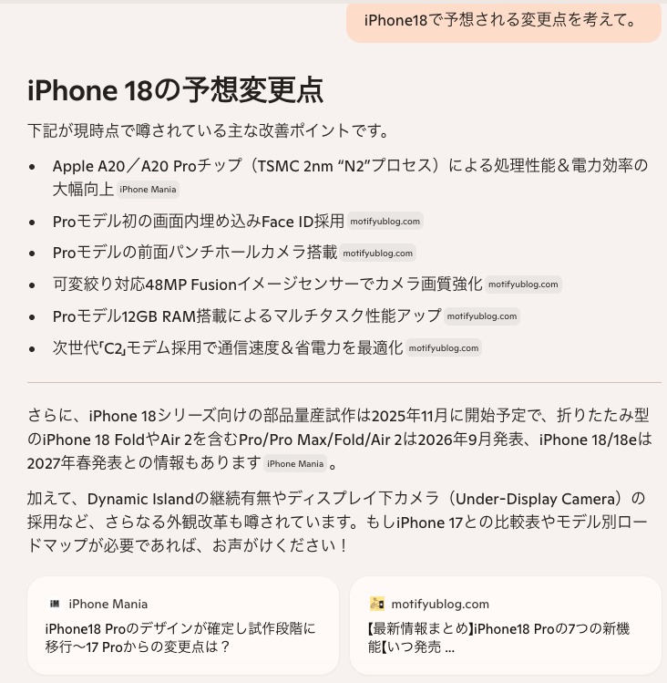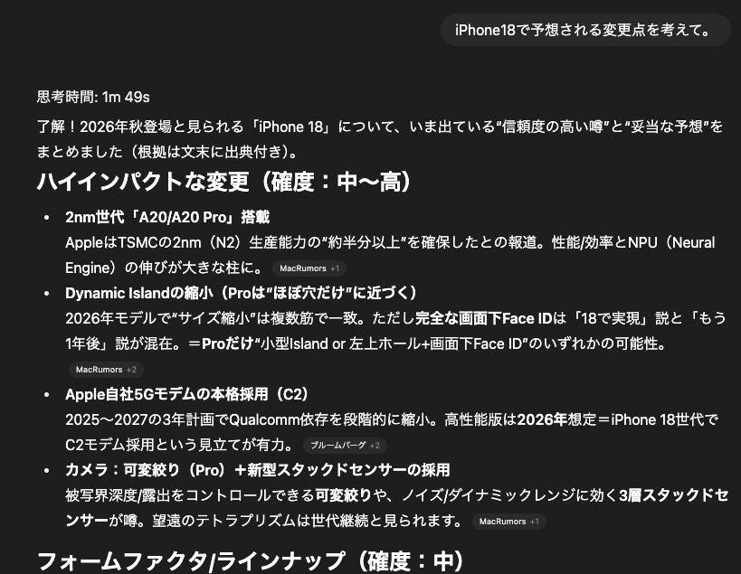 「iPhone18で予想される変更点を考えて」と聞いてみた。