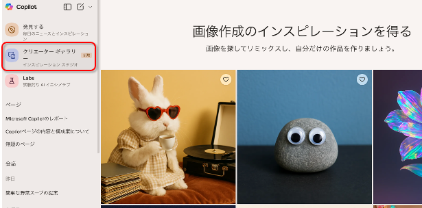 まずやってほしいのが、「クリエーターギャラリー」を参考にすること。Copilotのサイドバーから表示できる。