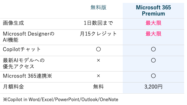 無料版と有料版(Microsoft 365 Premium)の違いを表にまとめた。