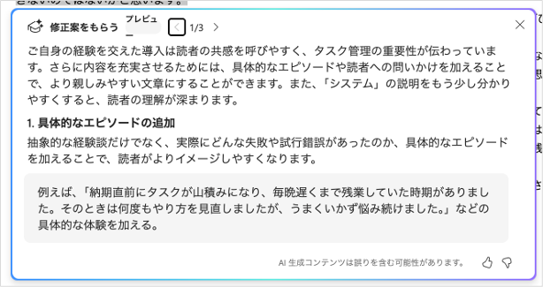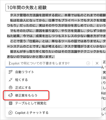 文章の一部を選択してCopilot→[修正案をもらう]から指示できる。