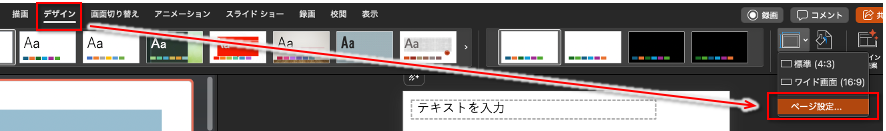 「デザイン」タブ → 「スライドのサイズ」 → 「ページ設定」