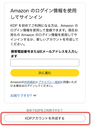 [サインアップ]から、次の画面で「KDPアカウントを作成する」を押します。