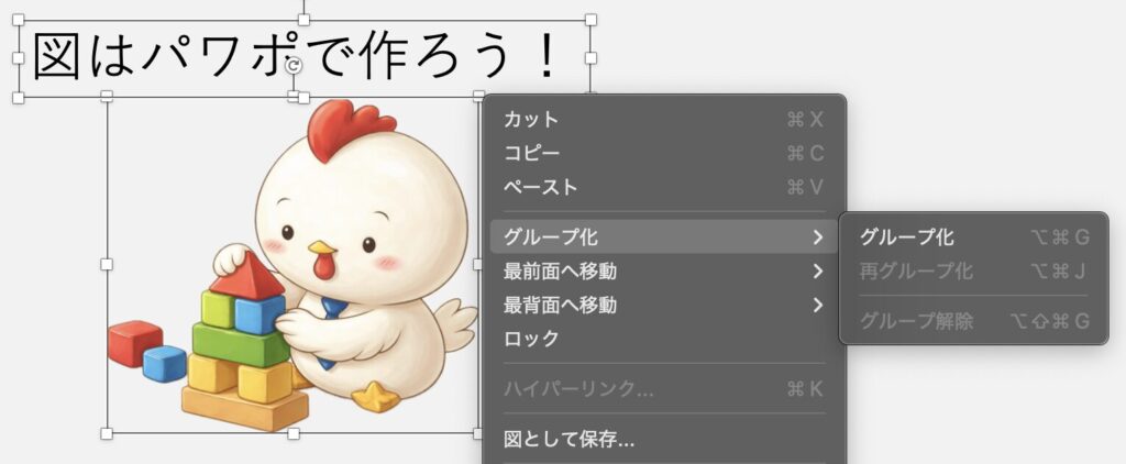 パワーポイントで図や表を作ったら、作った図を全部選択して「グループ化」します。