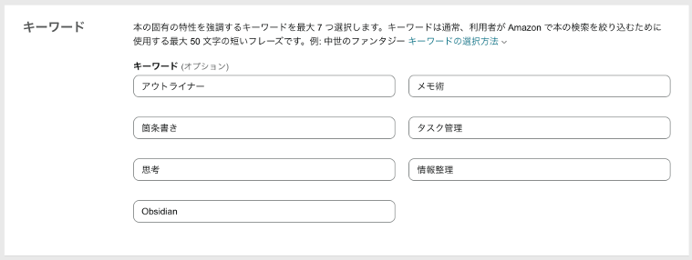 Amazonで検索されたときに、ヒットしやすくするためのキーワードです。