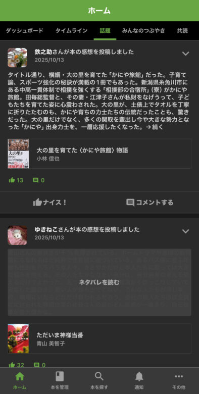 他のユーザーが読んだ・読んでる本がタイムラインに流れてきますが、いいねの数は非公開など注目を集める必要もないため、「良い感想を書かなきゃ」みたいなプレッシャーもありません。